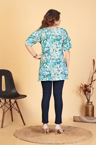 ELITEXPO Women Magic Flex Cotton Floral Printed Tunic with Lace & Button Work Round V Collar Neck Half 3 4 Sleeve | Soft Comfortable Short Kurti | Multicolor (in, Alpha, 3XL, Regular, Multicolor 1)