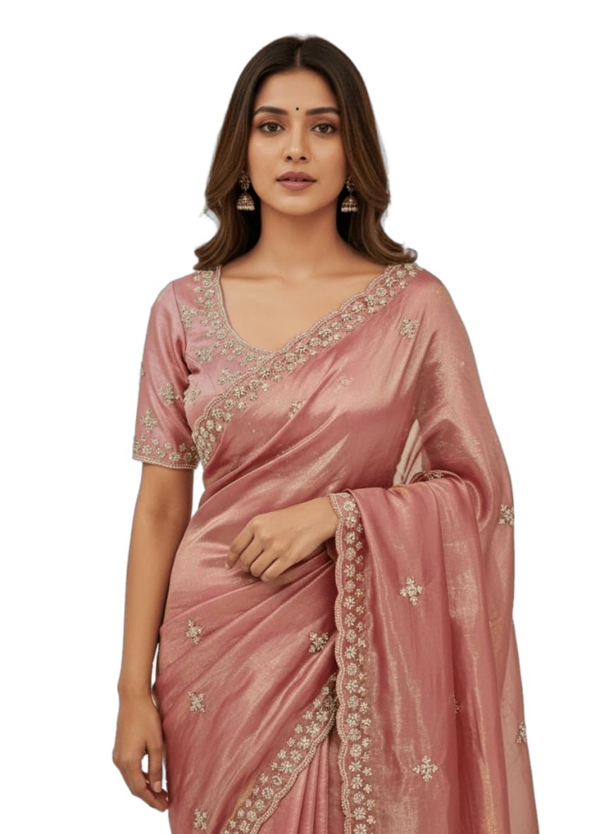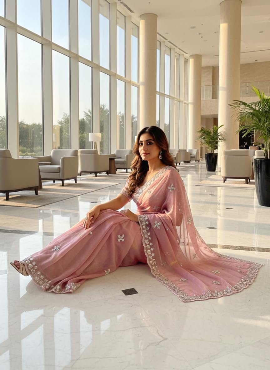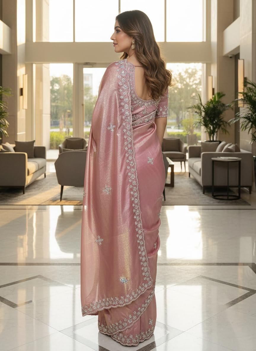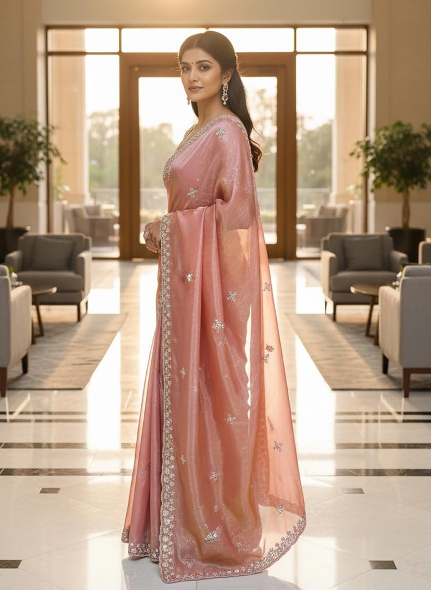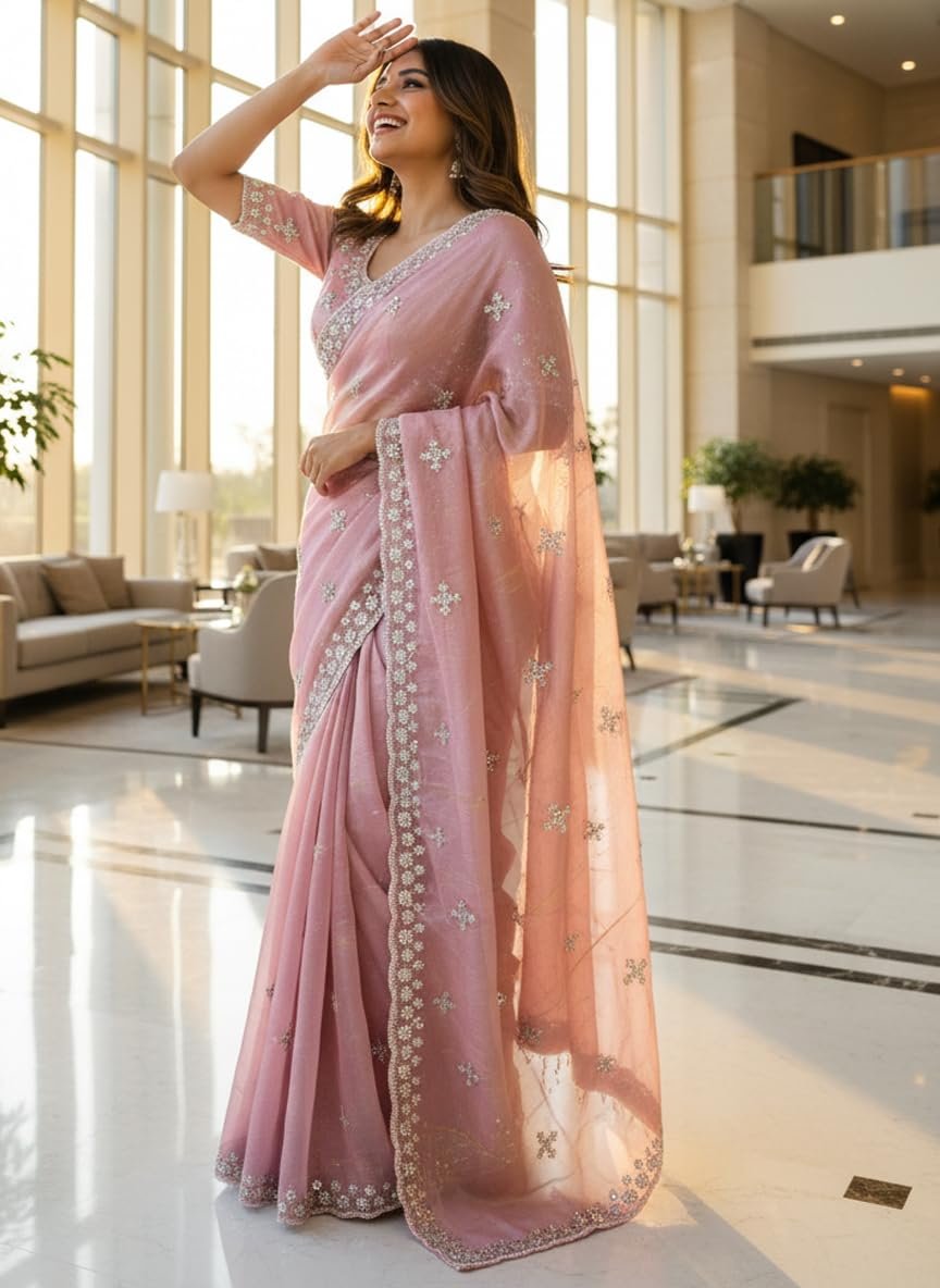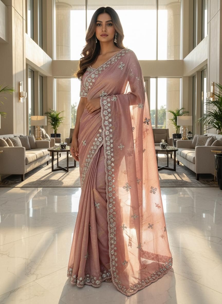 - Saree details- Saree Color: Dusty Rose| Material: Organza Tissue Silk | Length: 6.3 m | Pattern: Floral | Work Type: Beads Handwork