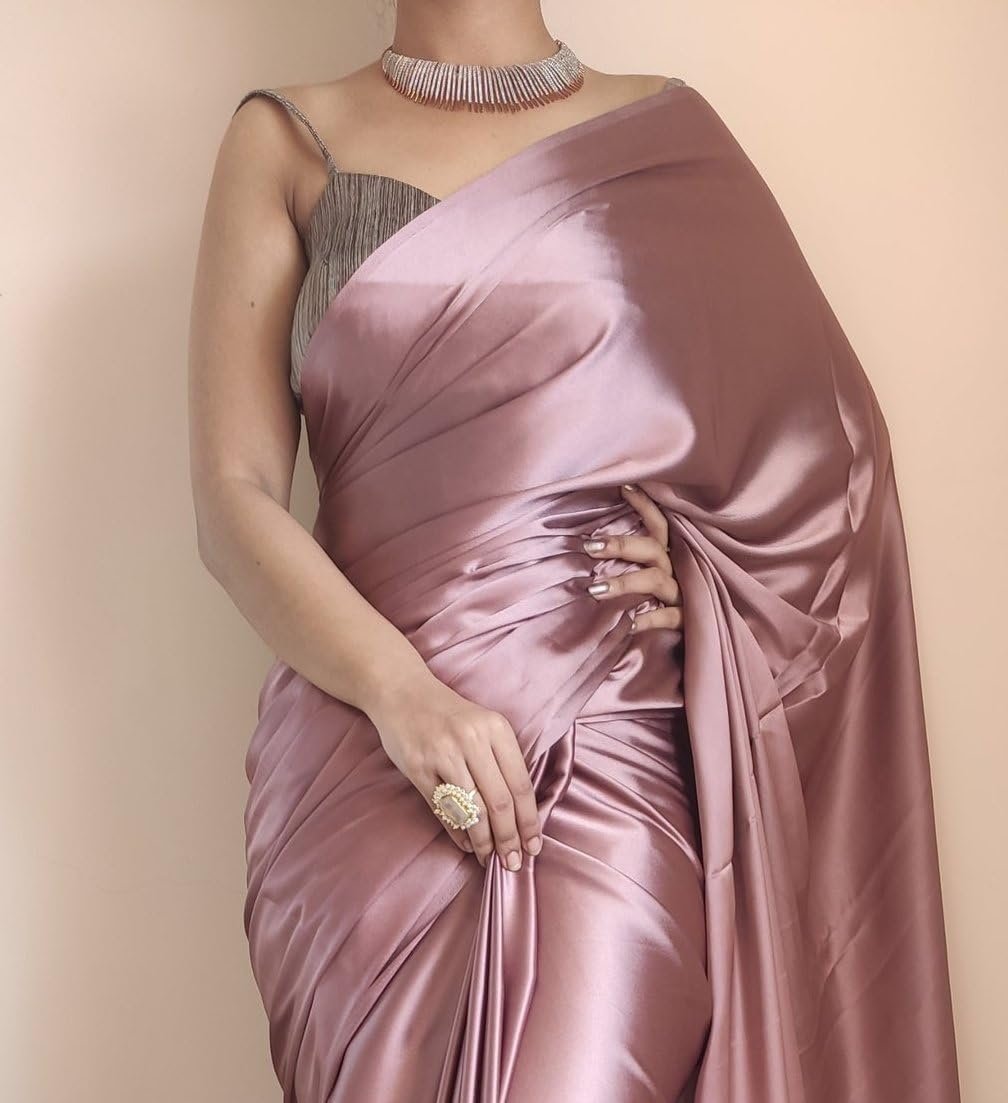 SATAZ Women’s Ready to Wear Rose Gold Satin Silk 1 Minute Pre Pleated Readymade Saree with Unstitched Rose Gold Blouse