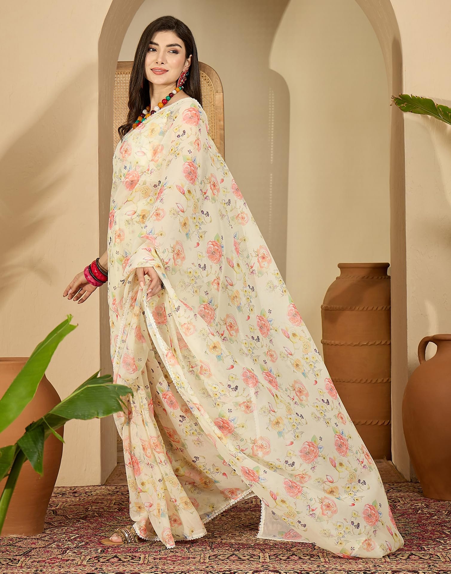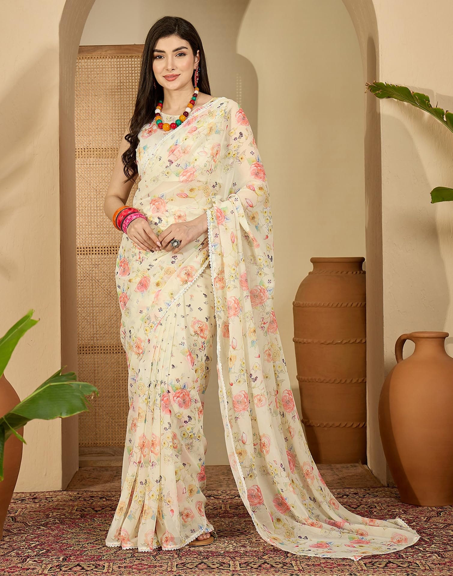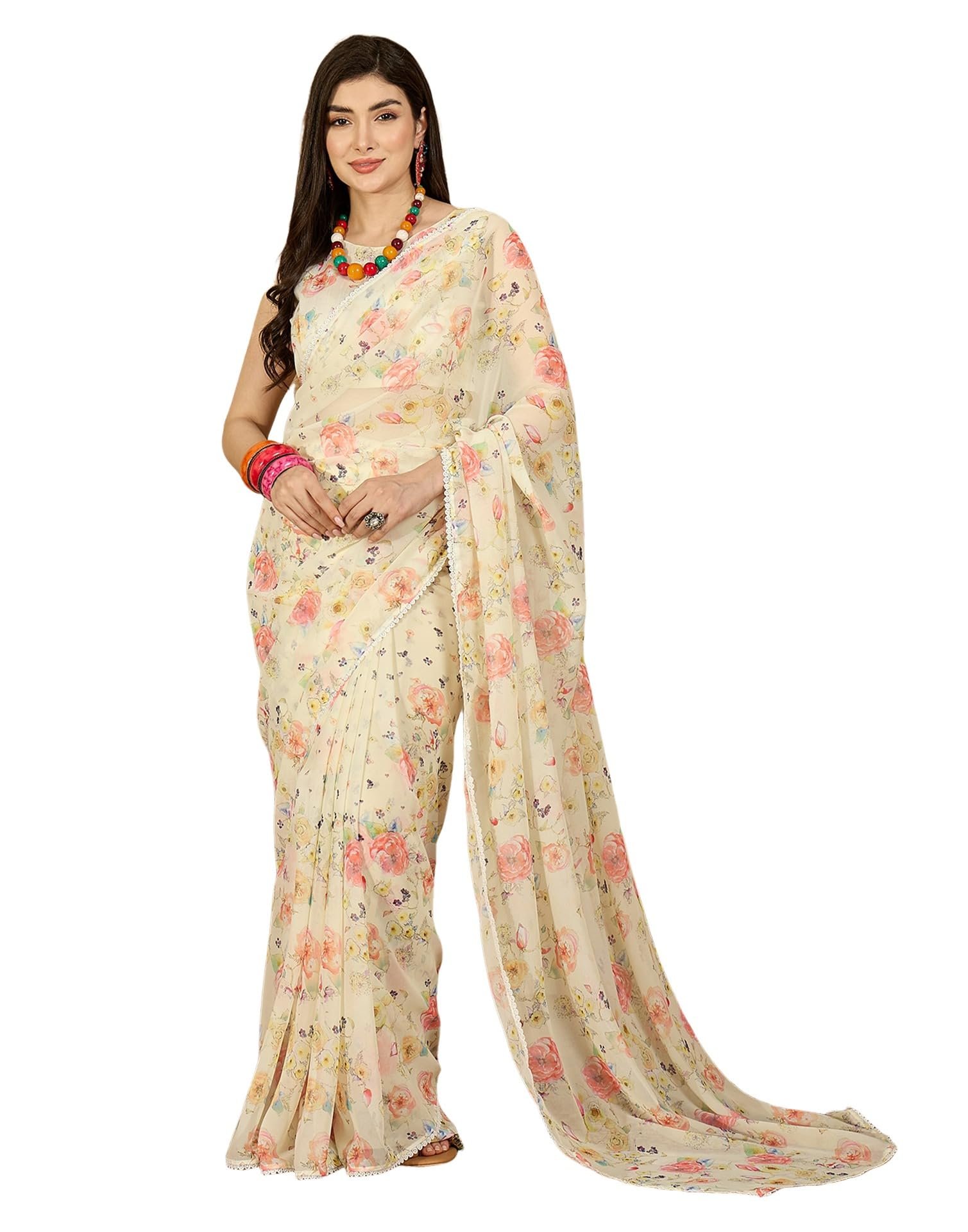 - Fabric :: Saree : Georgette | Blouse : Silk | Work :: Saree : Lace & Screen Printed | Blouse : Printed