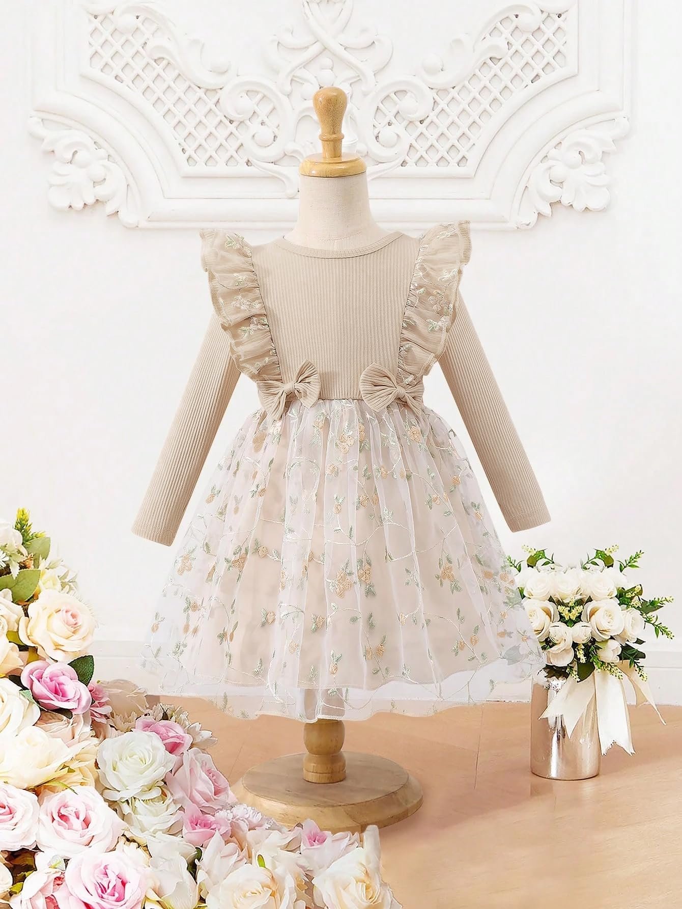 Tagas Girls’ Dress|Elegant Beige Baby Girl Dress with Lace Ruffles & Floral Embroidery – Long Sleeve Princess Birthday Party Dress | Comfortable & Stylish Kids Wear| PartFrock for Kids |