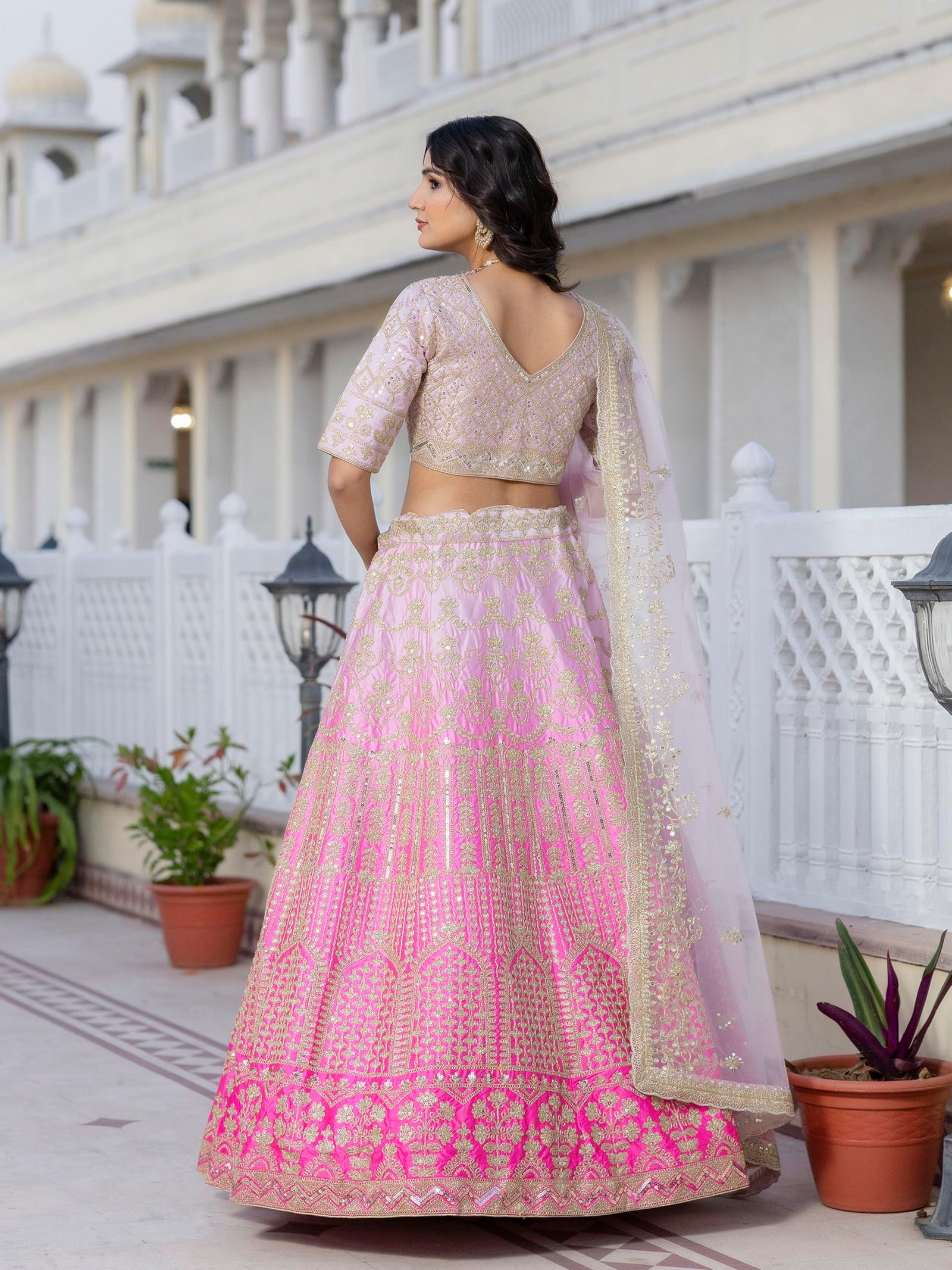 - Color: Lehenga: Pink; Choli: Pink; Dupatta: Pink