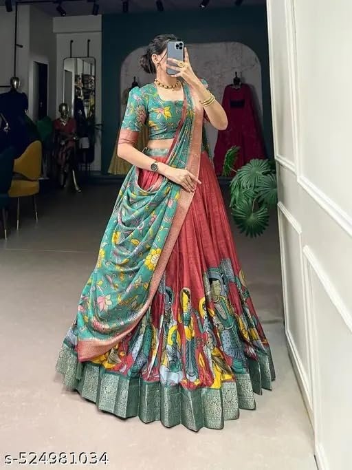 Women’s Tussar Silk Lehenga Choli Set Semi-Stitched | Patola Print with Foil Work | Unstitched Blouse | Designer Ethnic Wear for Navratri, Wedding, Festival & Party (Red)
