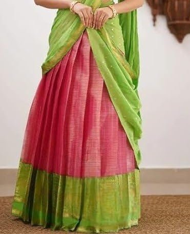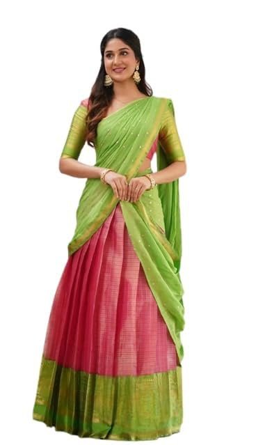 • Elegant Design: This gorgeous kanjivaram silk lehenga choli half saree features a vibrant pink and blue colour combination with intricate embroidery and zari work.