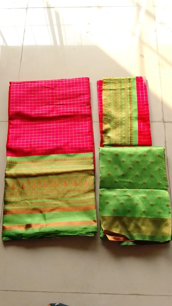 ZITON Women’s KanjiVaram Silk Pure Zari Weaving Lehenga Choli Beautiful Checks Design with Dupatta Blouse (Cheks Pink Green) (Unstitched)